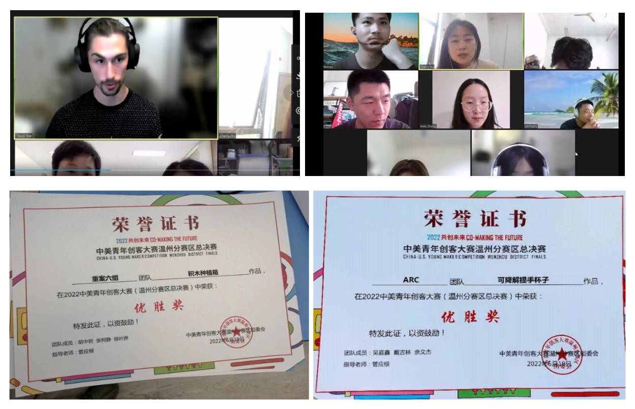 中美联合组队开展线上项目研讨和温州分赛区的获奖证书