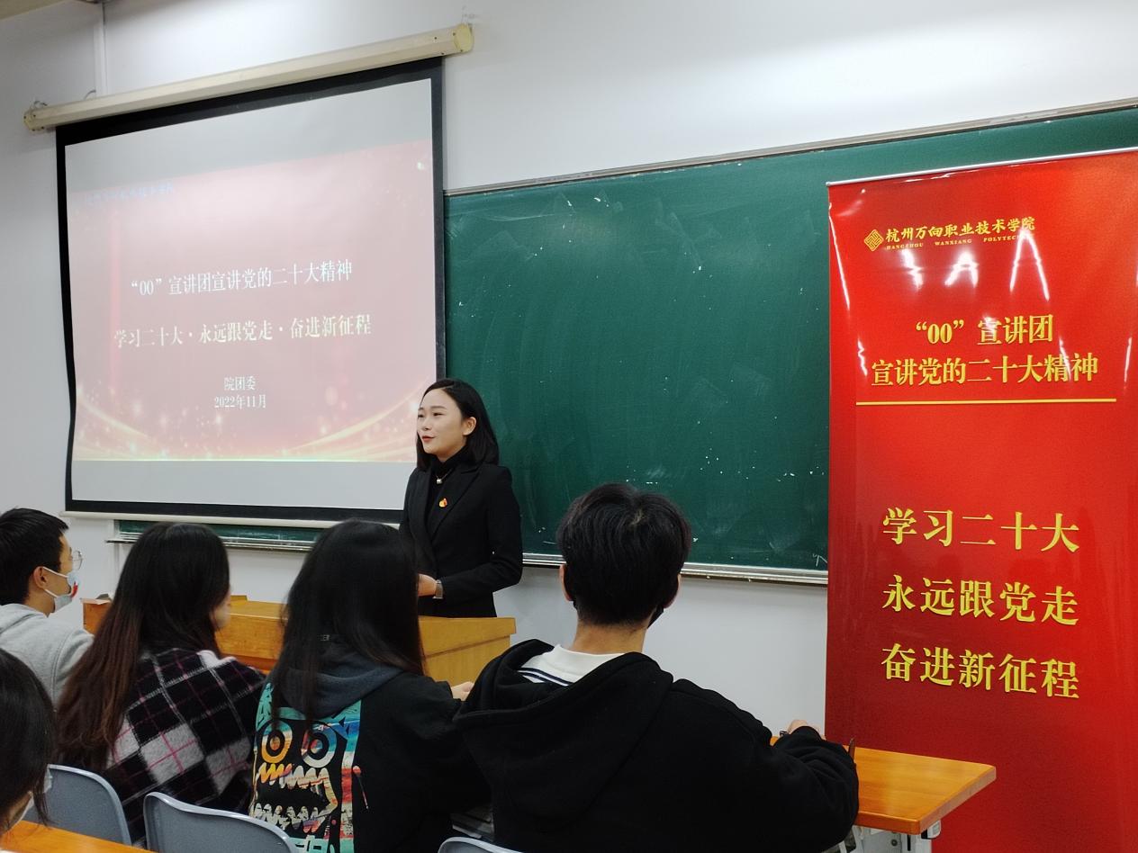 为深入学习宣传贯彻党的二十大精神,近日,院团委组织“00”宣讲团开展“学习二十大 永远跟党走 奋进新征程”主题宣讲活动。一场场宣讲快闪活动在教室、公寓、社团活动室等不同场所开展,并通过主题团日、学习交流会等不同形式掀起青年学生学习党的二十大精神热潮。